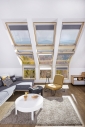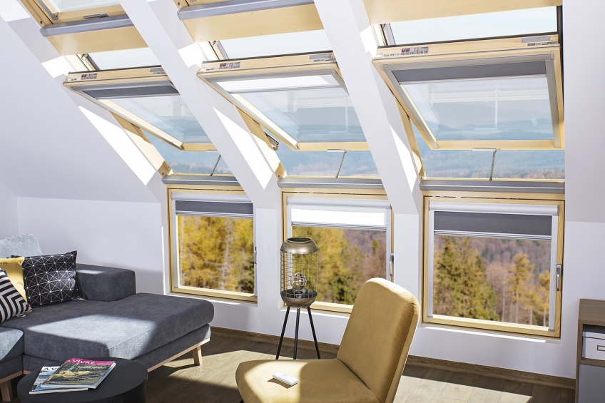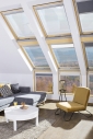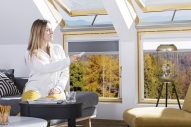 Fenêtre de toit à rotation équipée en usine de dispositifs (centrale, servomoteur et transformateur) permettant son ouverture et fermeture à distance ainsi que le contrôle des accessoires à l'aide d'une télécommande (vendue séparément). Elle est également équipée d'un détecteur de pluie qui active automatiquement la fermeture de l’ouvrant en cas de pluie. Des contacts sur le dormant facilitent l'installation des accessoires électriques.